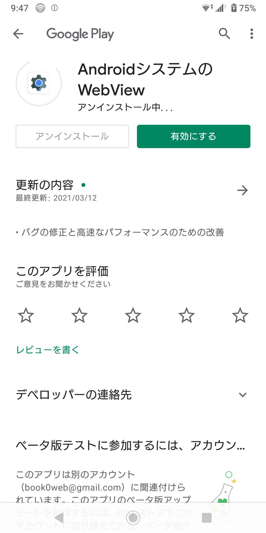 私はXperiaでAndroid10なのですが、設定→「アプリと通知」→「全てのアプリ」で検索窓にて「web」と検索してこのアプリまで辿りつき、停止・アンインストールで再起動後良くなりました。過去にもこのアプリで問題があったようなので手順を画像で説明します。