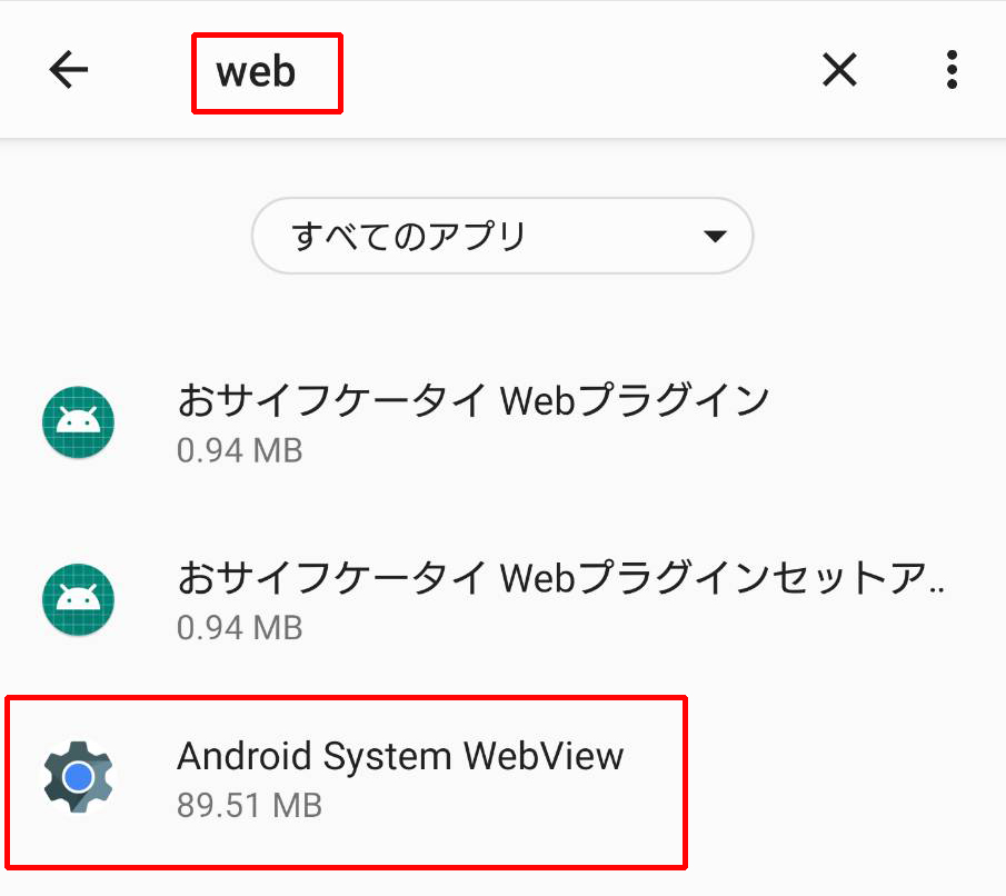 4.赤枠の検索窓へ「webと入力」、入力後「webview」が表示されたらクリック
