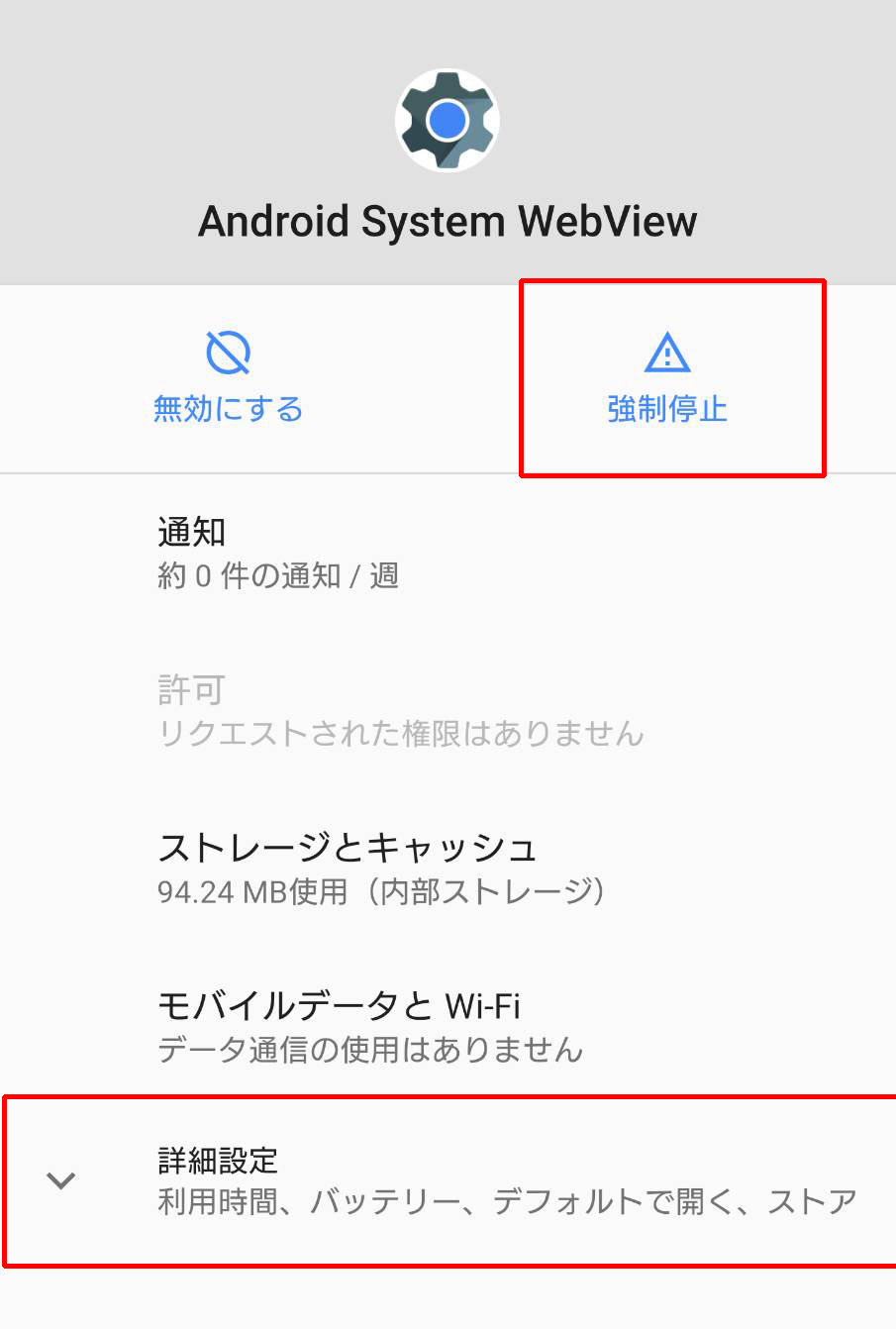 取りあえず、強制停止で様子を見てみましょう。アプリを消したい場合は下の赤枠の「詳細設定」を選択します。