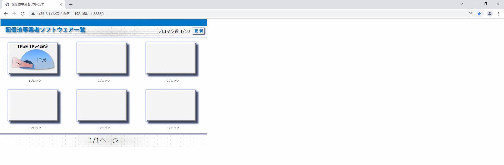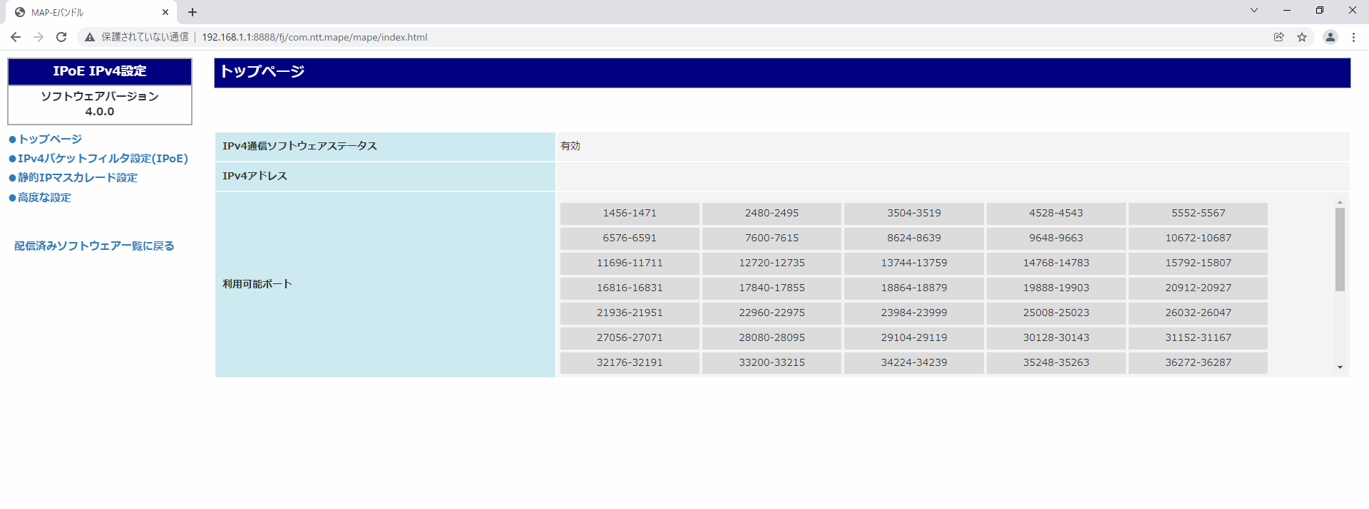 URLに「192.168.1.1:8888/t」を入力するとこの様な画面が出ます。ここで「IPoE IPv4設定」を選択します。