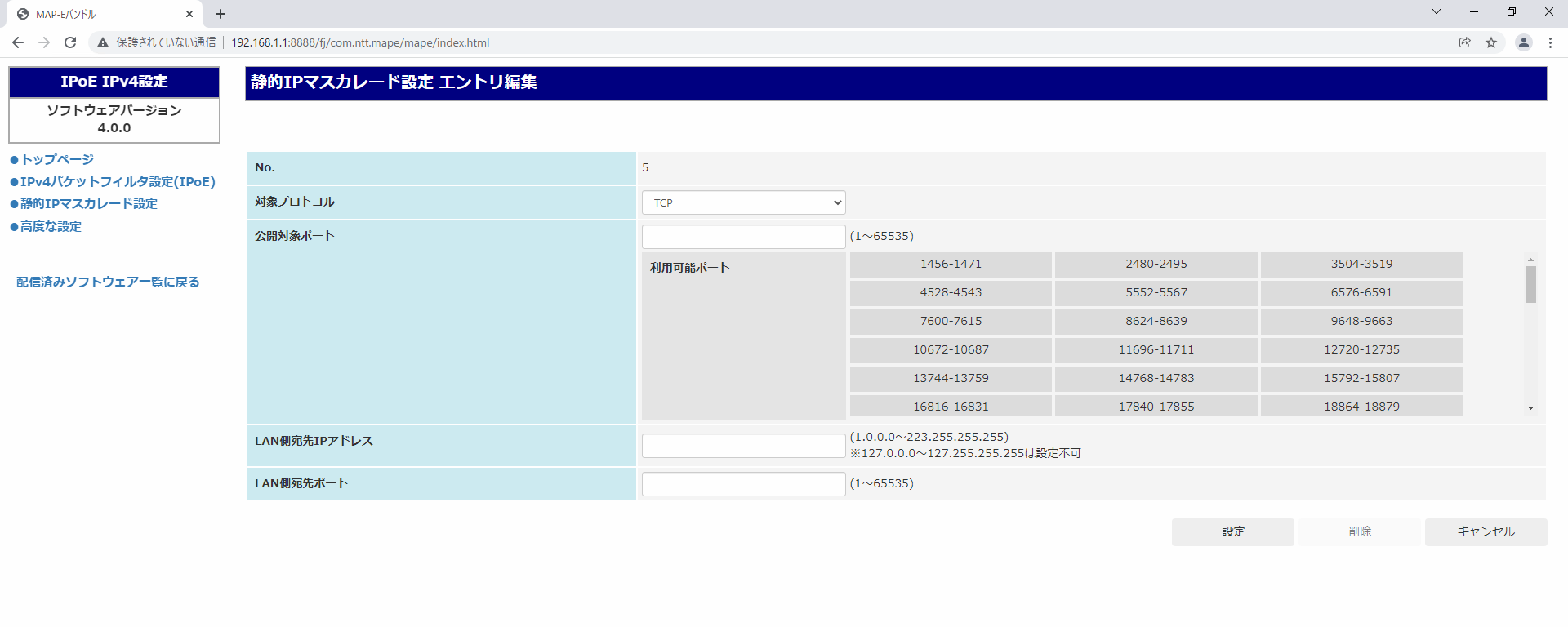 入った画面では「利用可能ポート」と言う画面がありました。なるほど!ここでポートフォアードをするのか!!と理解しました。取りあえず、1456-1471まで空いているようなので、1456から入ってきた物を80番に飛ばすように設定してみます。