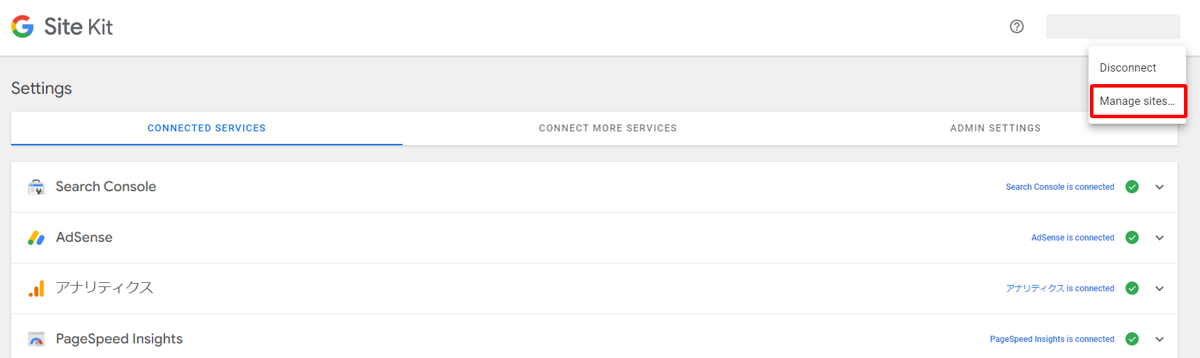 紐付けされていないGoogleアカウントでSite Kitの登録をした後はダッシュボード内のSite Kitの項目が表示されます。元々紐付けされていたアカウントではこの項目すら出ませんでした。