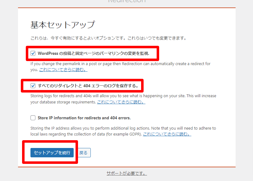 次に上の赤枠二行にチェックを入れ、「セットアップを続行」を選択する。