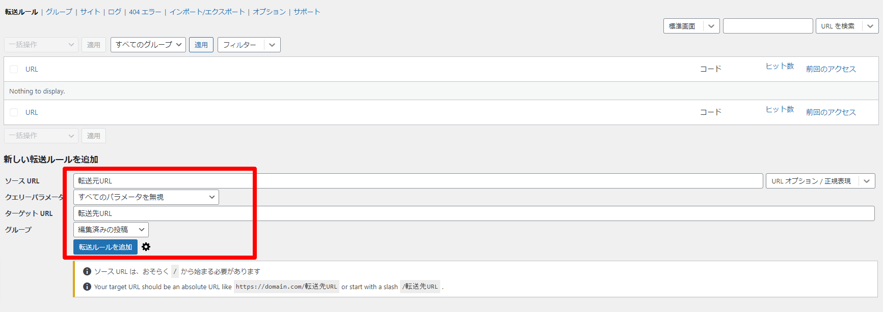 赤枠通りに選択する。「転送元URL」と「転送先URL」はご自身の環境に合わせてください。以上で設定は完了で必要がなくなればこの設定画面からリダイレクト設定を削除できます。