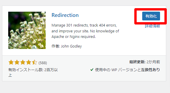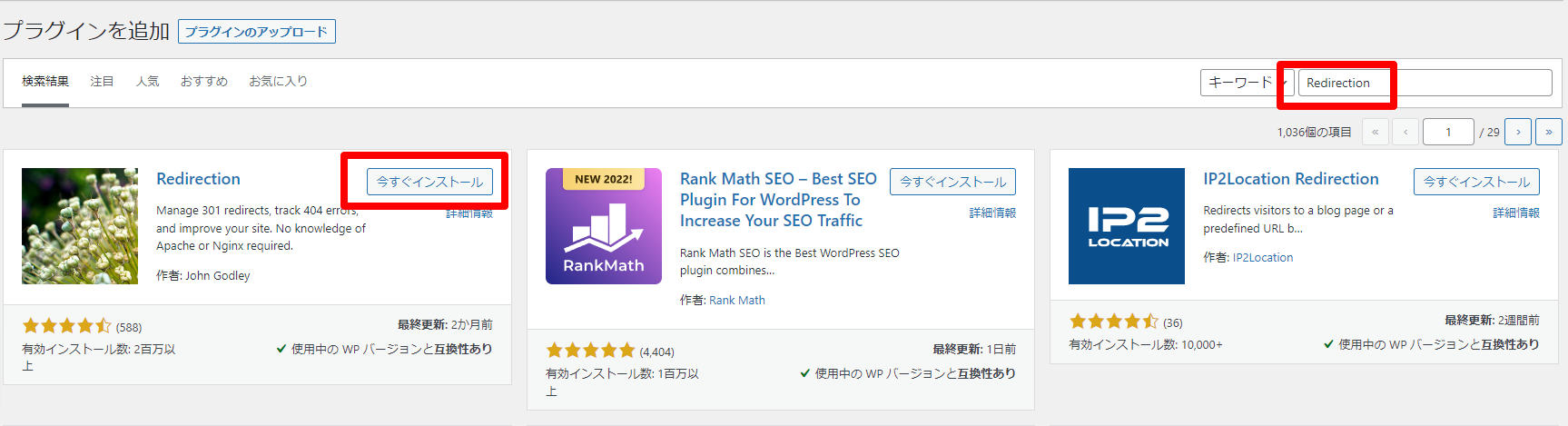 WordPressにログインして、ダッシュボードからプラグインを選び新規追加で「Redirection」と入力し、「