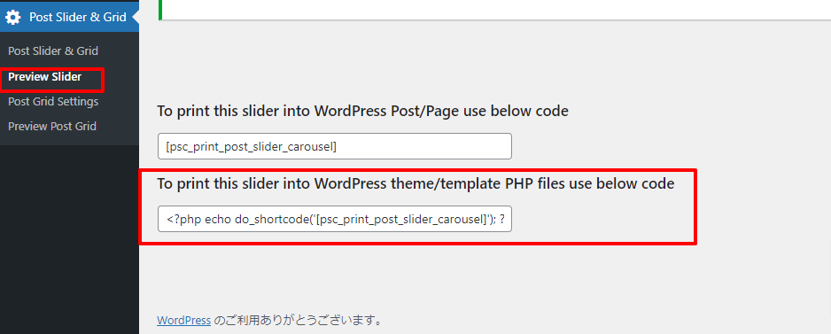 記事内などに表示させるショートコードです。 - To print this slider into WordPress theme/template PHP files use below code