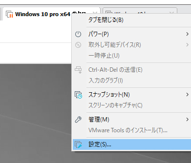 仮想PCをシャットダウンしたら、シャットダウンした仮想PC名タブを右クリックして設定を選択します。