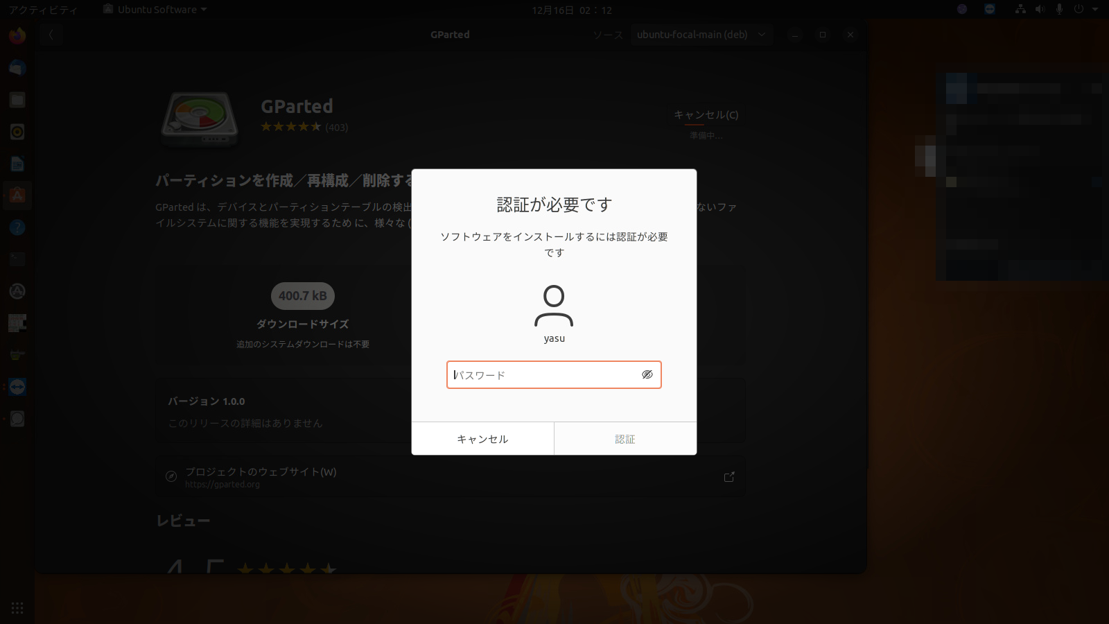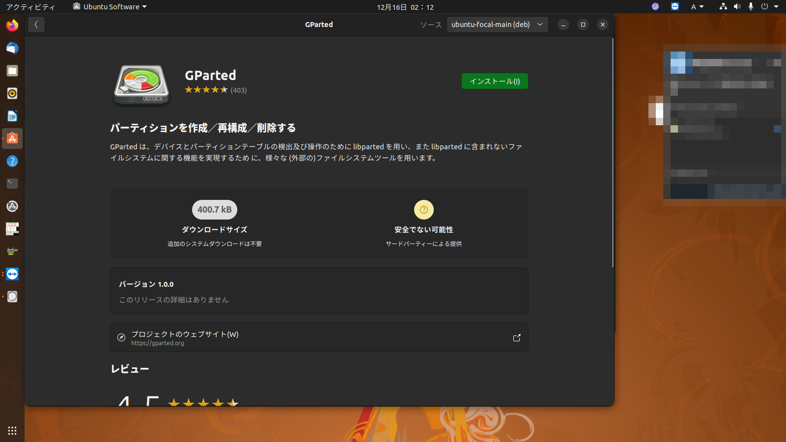 まずは「ubuntu software」を起動するし、「GParted」と入力して右上に表示されるインストールする。