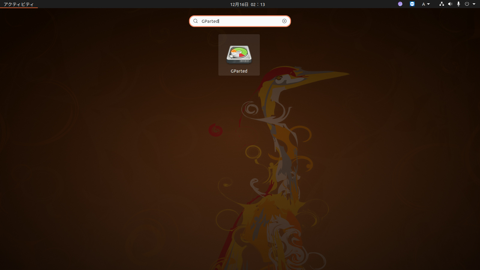 デスクトップの左上の「アクティビティ」を押して検索窓で「GParted」と入力