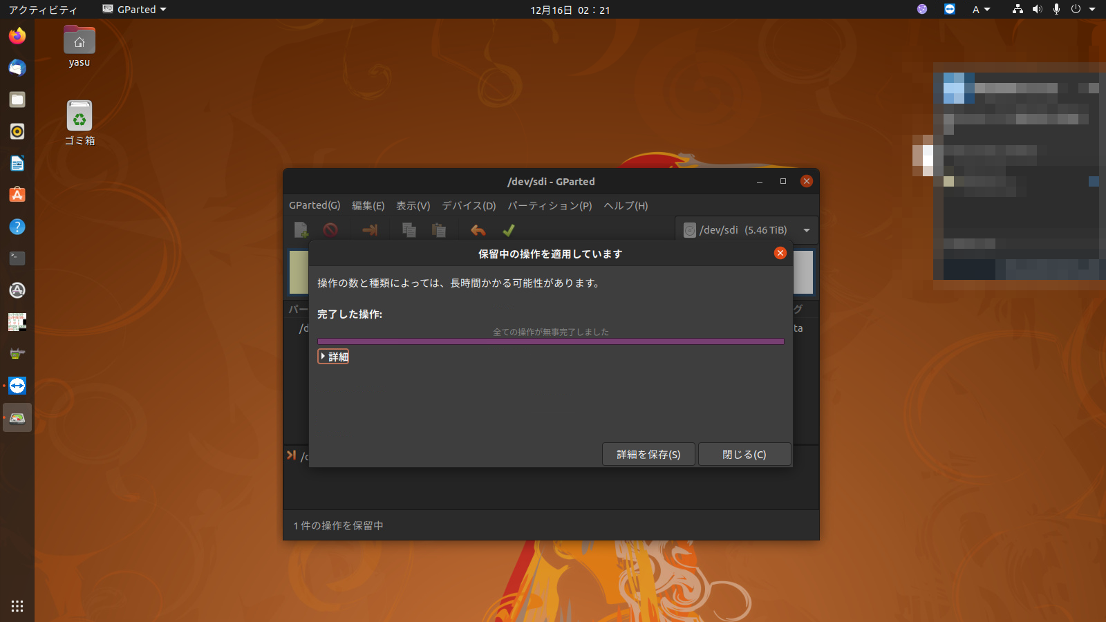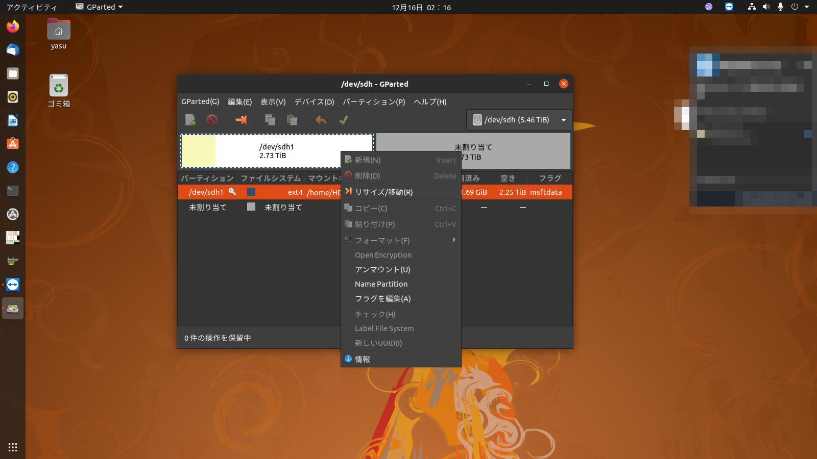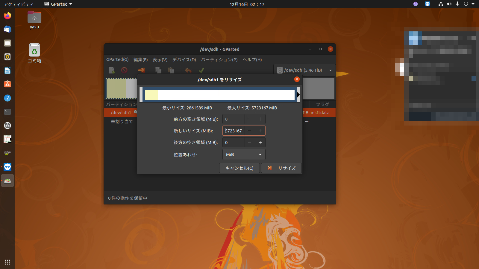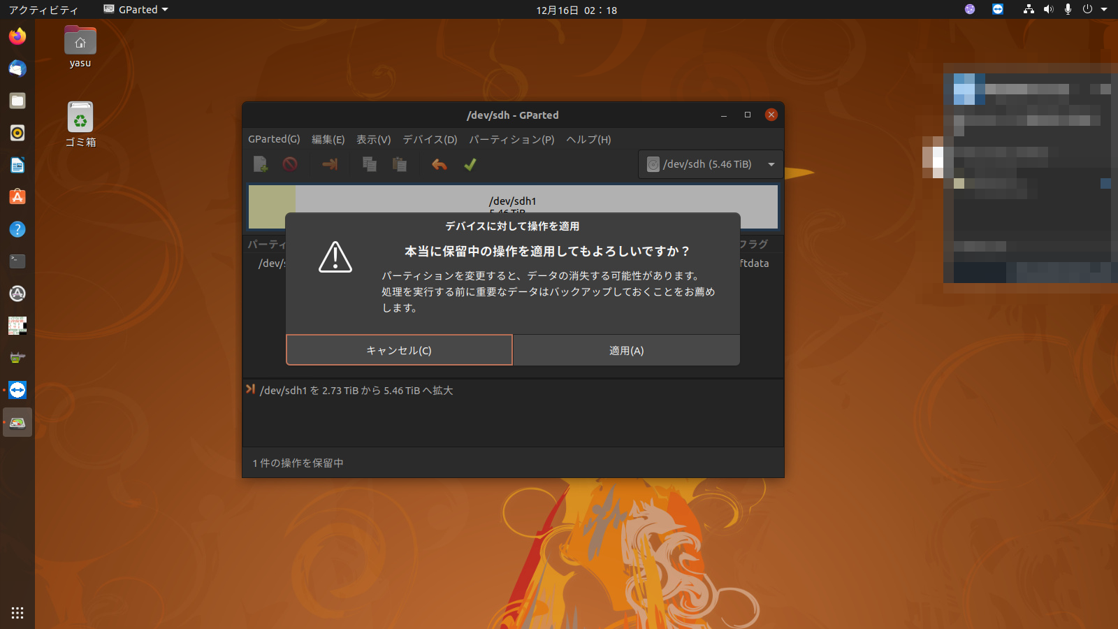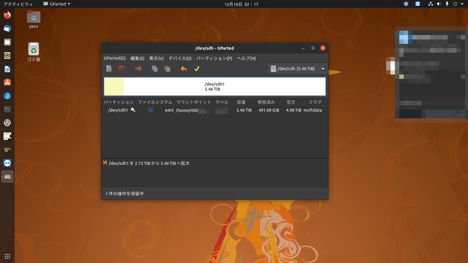 ubuntuでGUIを用いたHDDの拡張・結合・拡大の完了
