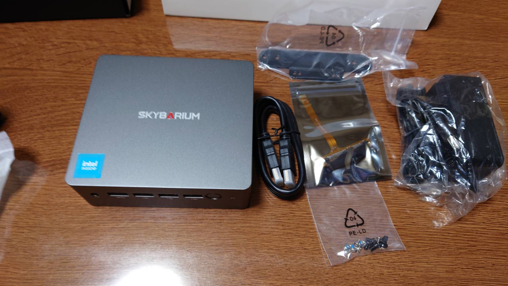 付属品はミニPC本体、HDMIケーブル、SATA追加用ケーブル、VESAマウント用金具(ビス付き)、電源でした。