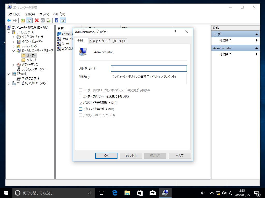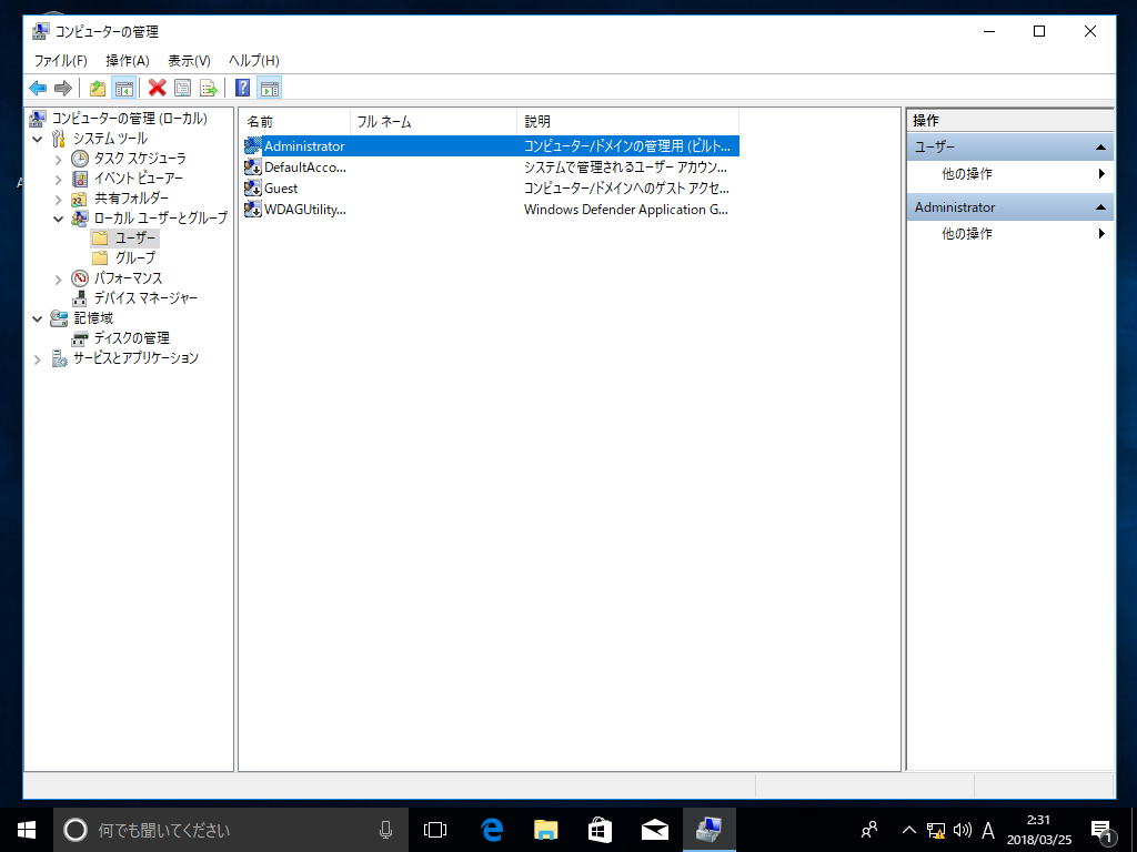 このままでは、Windows10標準ブラウザMicrosoft Edgeが開けなかったりとユーザー権限で引っかかりますので、通常ユーザーのように使えるように設定方法をこれから追加していきます。