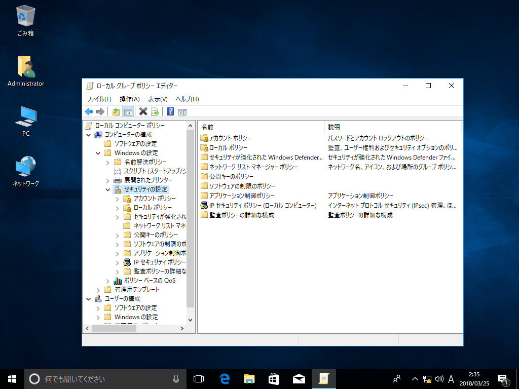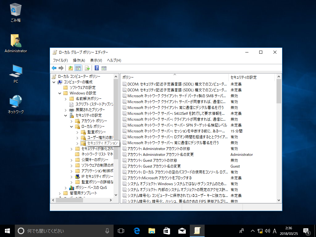 こちらで、選ぶ項目を書いていきます。左のサイドメニューより「windowsの設定」→「セキュリュティ設定」→「ローカルポリシー」へと進みます。