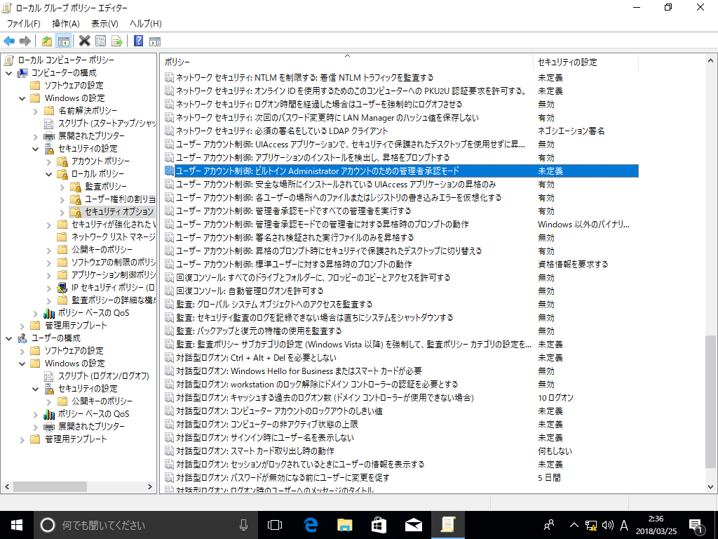 ウィンドウを大きくするか、スクロールして「ユーザー アカウント制御: ビルトイン Administrator アカウントのための管理者承認モード」を探し、選択します。