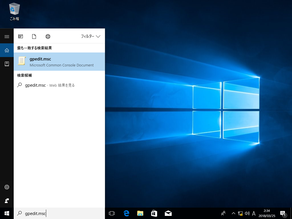 まずはタスクバーの検索部分より、「gpedit.msc」を選択します。タクスバーの検索を非表示されている方は、キーボードのWindowsマークのボタンを押してキーボードへ入力するとこの画面が表示され、入力が可能になります。