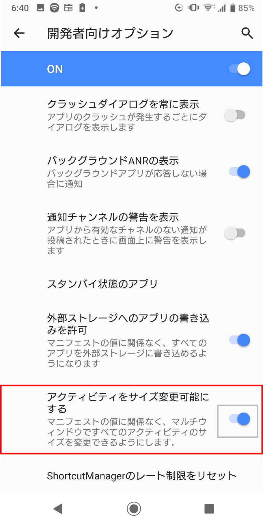 設定→システム→詳細設定→開発者オプション→アクティビティをサイズ変更可能にする(オフにする)