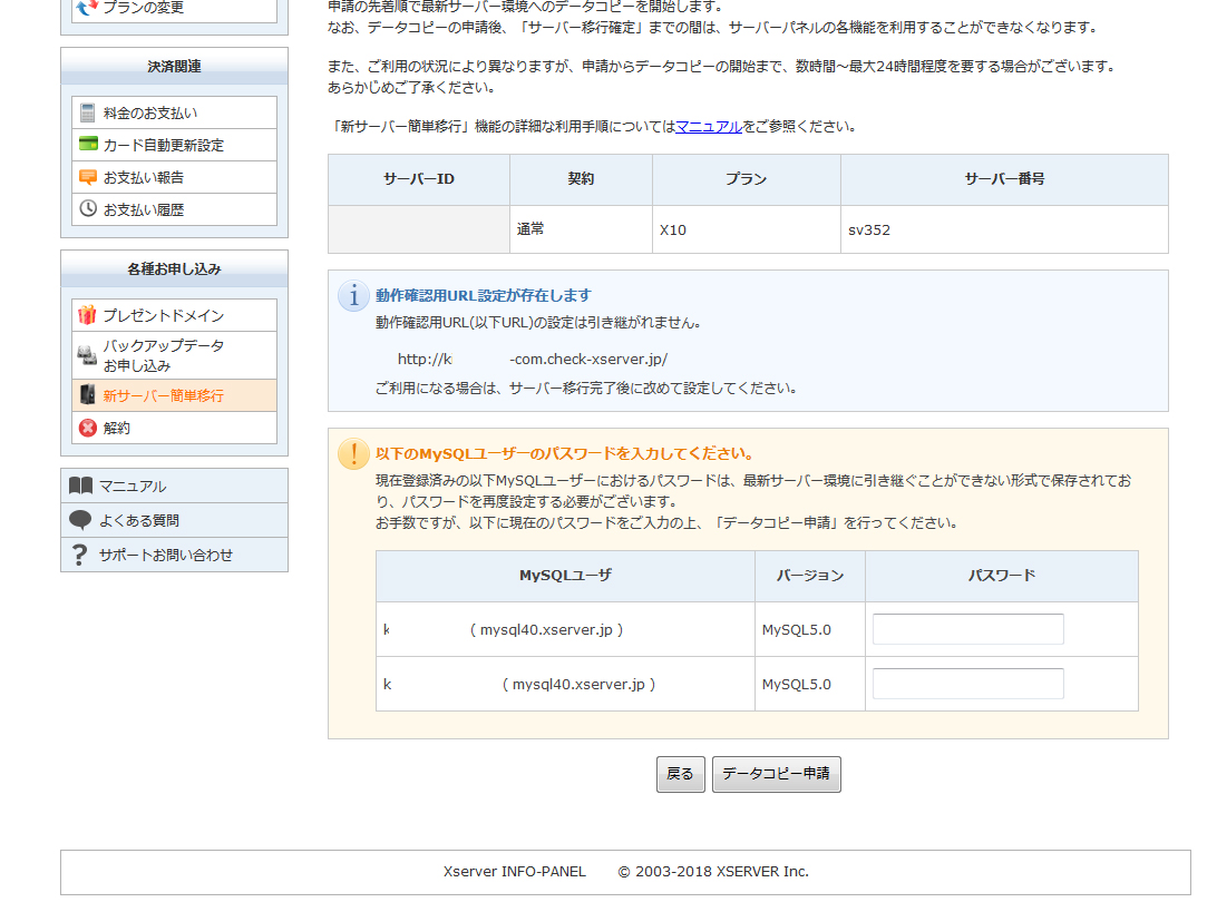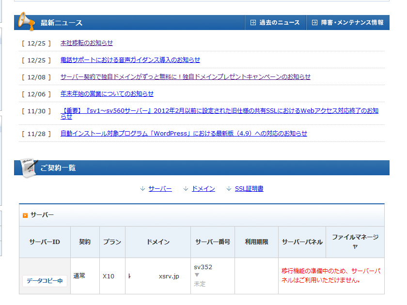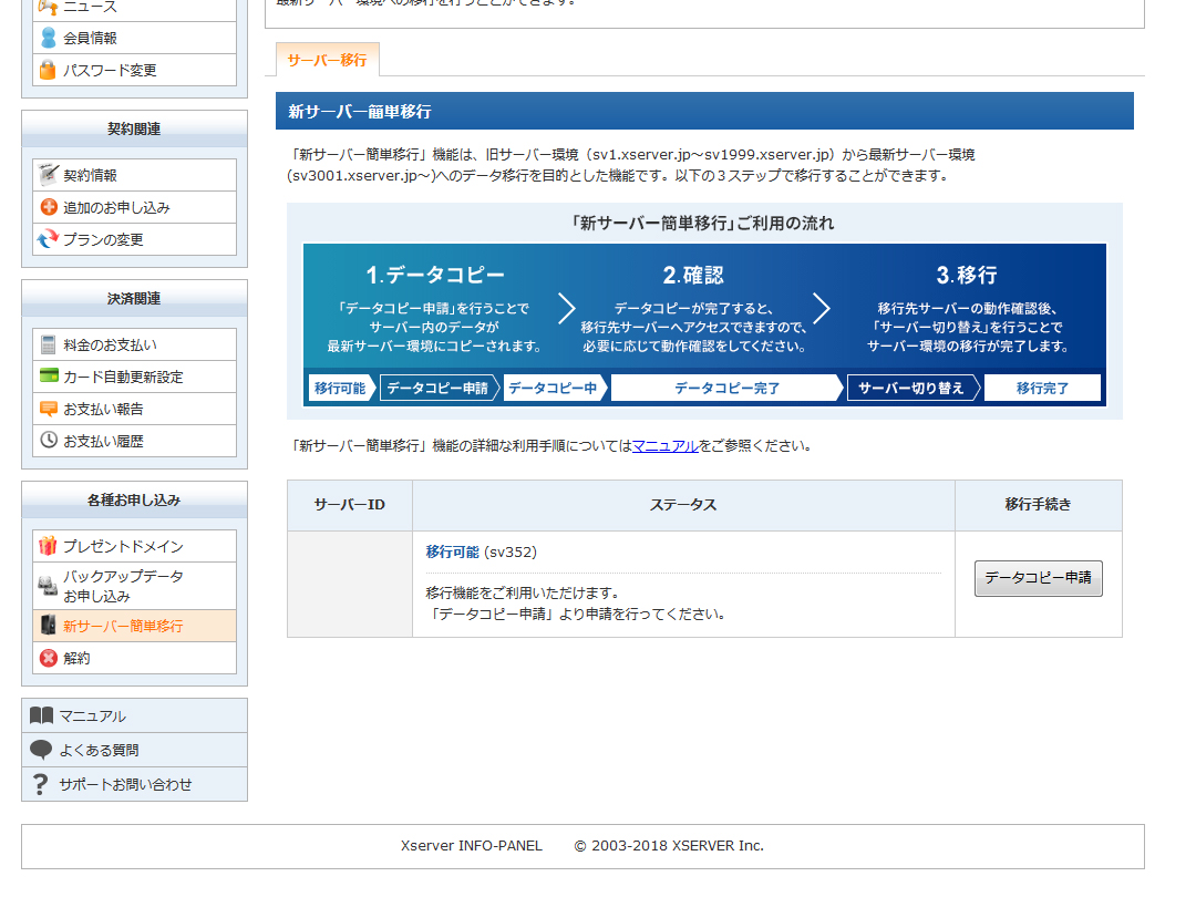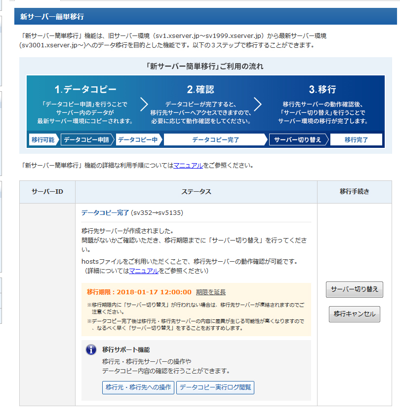 1-6.移行中はこの様にデータコピー中と表示されます。ここまでが新サーバーへ移行作業になります。エックスサーバー