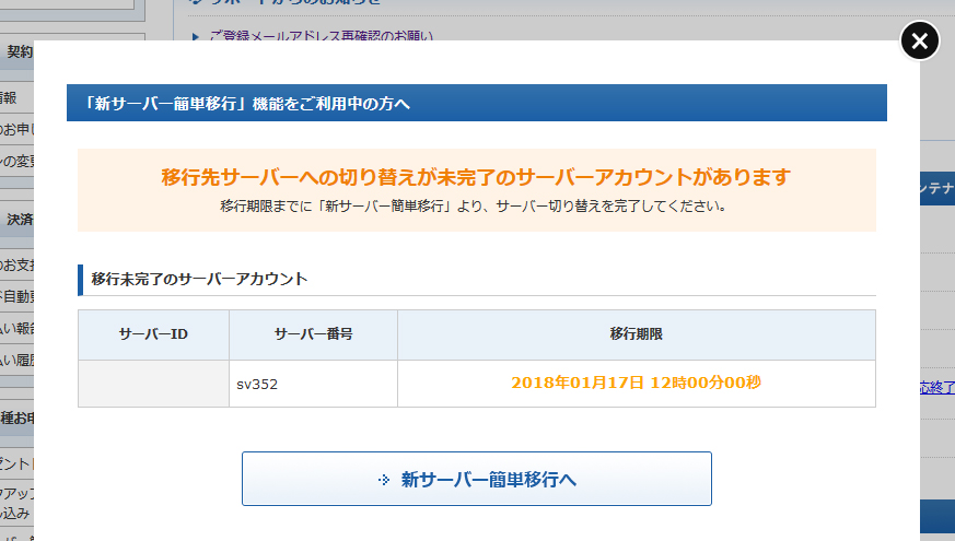 さんに登録しているメールアドレスへ「【Xserver】■重要■ [新サーバー簡単移行]移行完了のお知らせ (取得名.xsrv.jp)」でメールが送られてきます。この後、インフォパネルへログインして下さい。この下の画像のようにポップアップ画面が出てきます。ここの「新サーバー簡単移行へ」をクリックするだけです。