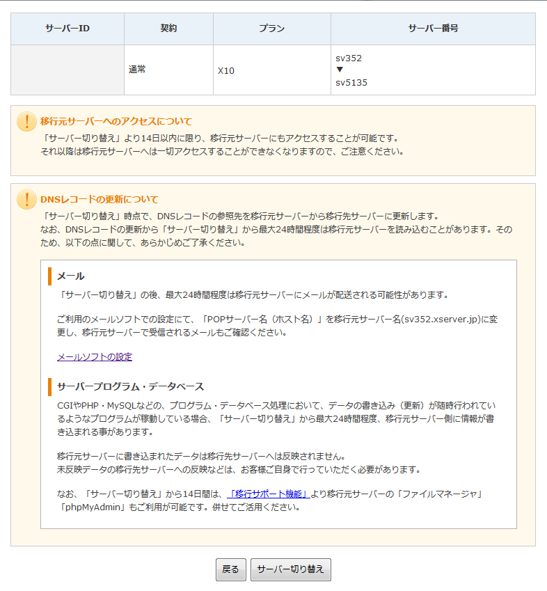 2-4.クリックすると移行元サーバーと移行先サーバー名が書かれた最終確認画面が出てきます。こちらでも「サーバー切り替え」ボタンをクリックします。