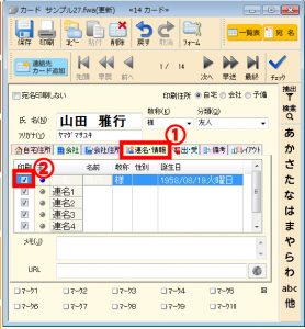 その設定方法は、ここの画面に送りたい相手の名前と住所の間に「自宅タブ」などありますね?ここで別のタブを選択します。別のタブとは「連名・情報」ですこれを選択します。タブ選択後に②で囲ってる「印刷」と言う項目があります。こちらの手書きしたい人の宛名部分のチェックを外すだけで出来てしまいます。